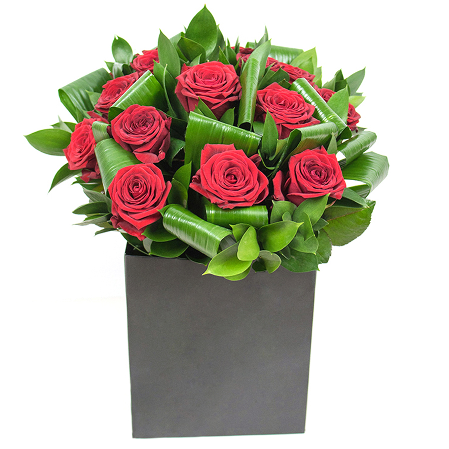 Our elegant fusion bouquet combines vibrant red roses with aspidistra leaves and ruscus, creating a unique and stylish floral arrangement that exudes sophistication.